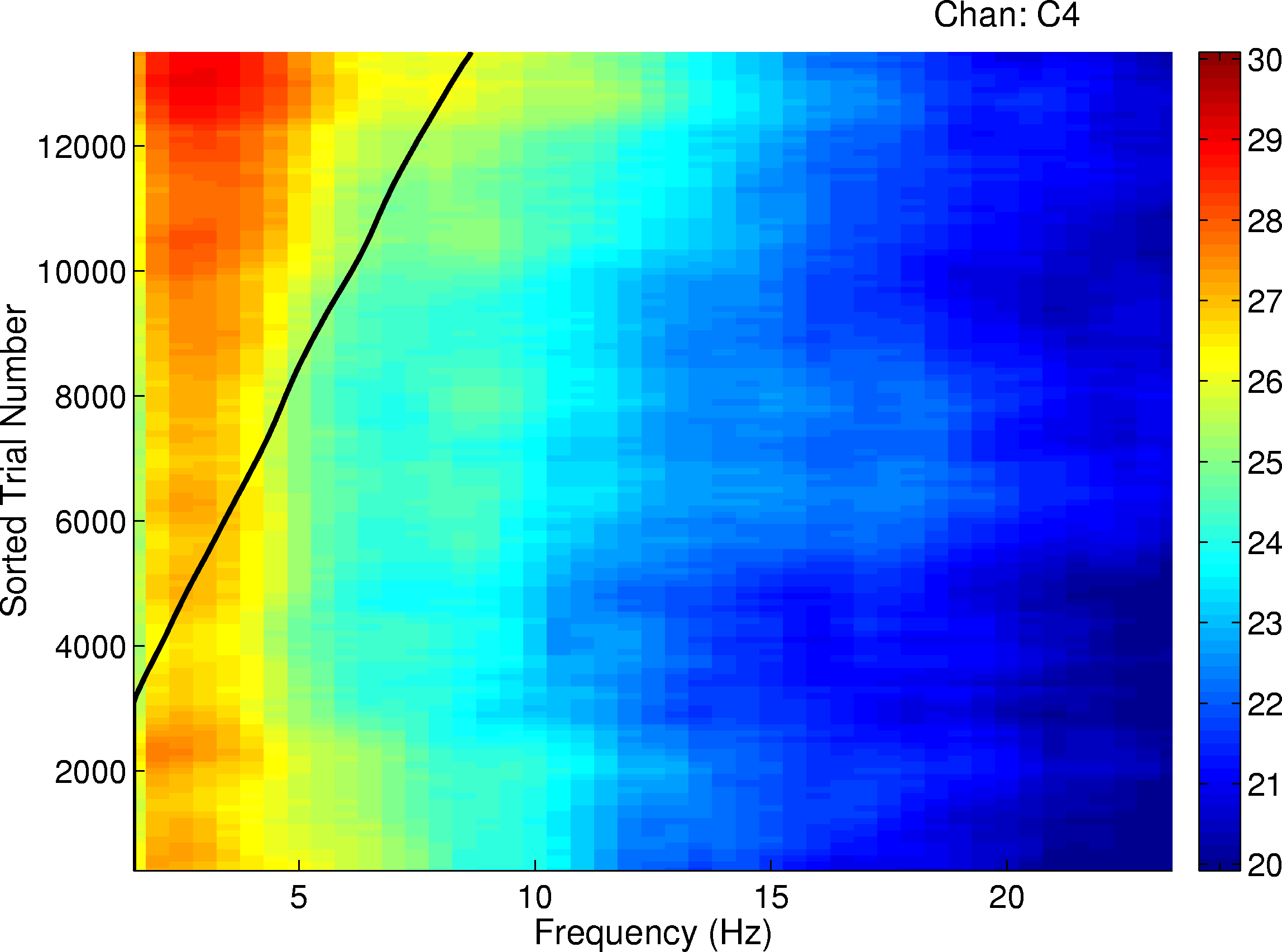EEG spectra at right central site C4 in 13,000 2 s task data windows (from all 4 participants) sorted by normalized disk distance in the 90 s window centered on the 2 s data window. X-axis: EEG frequency (Hz). Y-axis: sorted trial number. Gray scale: relative log EEG spectral power. The x-values of points on the diagonal black trace indicate the normalized disk distance (times 10). Note the increase in EEG power between 2-5 Hz power during periods of relatively poor performance (e.g., normalized disk distances above 0.5).Figure 5 shows the grand mean EEG spectra for all four participants at right central electrode site C4, constructed by first sorting the spectra for each of the 13,000 3 s trials by disk distance then smoothing the resulting image with a 0.05-wide smoothing window. The prevailing disk distance is shown in the figure by a thick black line whose x-value is ten times the prevailing disk distance (e.g., the thick line x-value of 7 represents disk distance = 0.70). The figure shows that the general increase in low-frequency EEG power during poor performance (i.e., at relatively large disk distances) was largest near 3 Hz. The circa 3-Hz peak was present in data from all four participants. However, no specific increase at sleep spindling frequencies (12-14 Hz) is visible even at maximum disk distance.