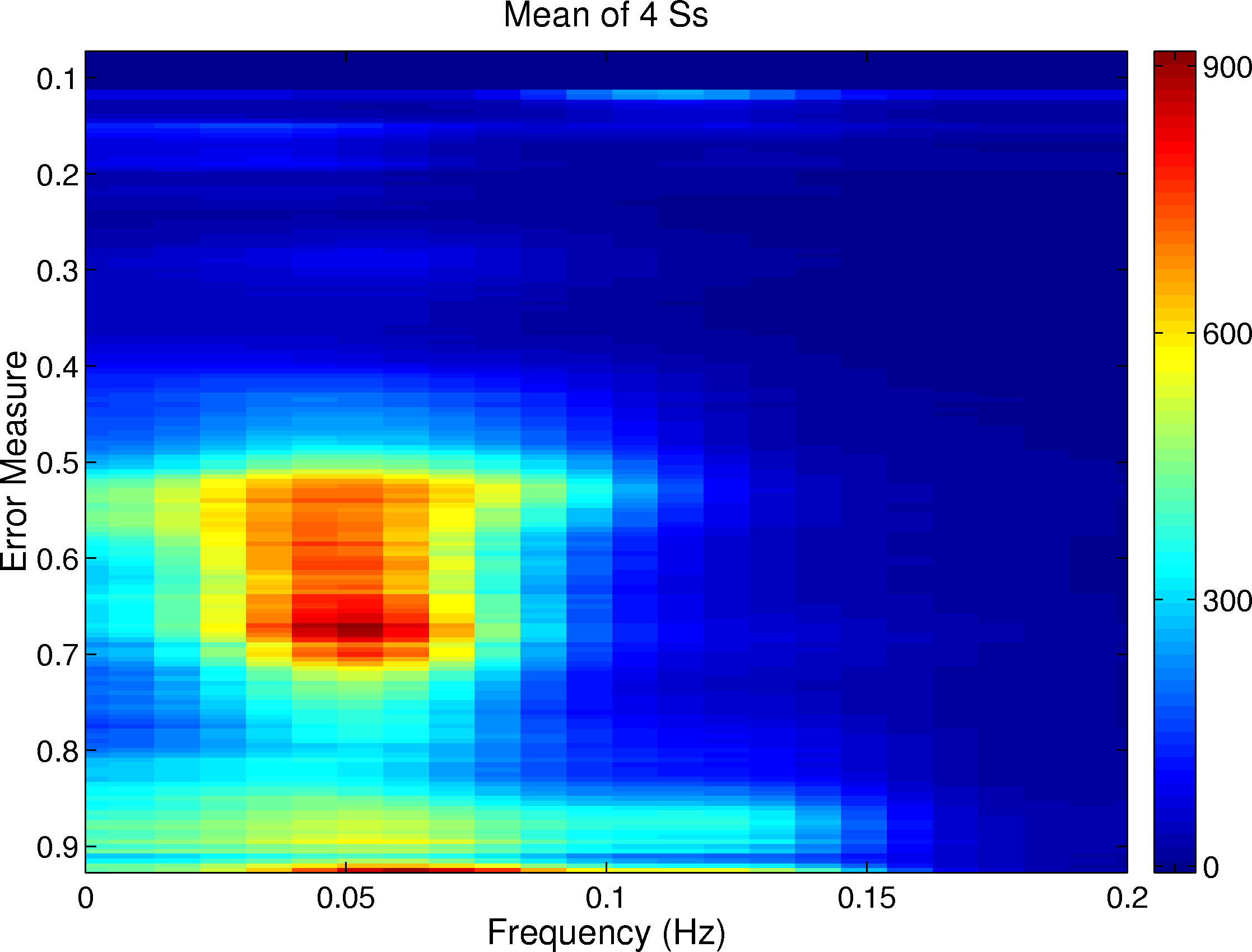 Figure 2. Grand mean power spectra (all 4 participants) of the performance time series autocorrelations (Fig. 1) sorted by performance error (normalized disk distance). X-axis: cycle frequency (Hz). Y-axis: Normalized disk distance. Gray scale: Mean cycle amplitude (change in disk distance per second). At relatively poor mean performance levels (0.5 to 0.7), a peak in the performance autocorrelation spectrum appears near 0.05 Hz, indicating the appearance of circa 20 s cycles between good (alert) and poor (or absent) performance (cf. Fig. 4 for example).